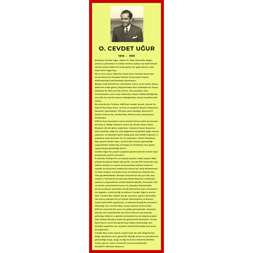 O yıllarda Türkiye’nin en büyük projesi, fiziki inşaatı 1965 yılında başlayan Keban Barajı’dır. Ancak DSİ tarafında inşa edilen barajın su tutma havzasındaki kalkerli arazinin sürekli su kaçırması nedeni ile inşaat bir türlü bitememekte hem maliyet artmakta hem de beklenen elektrik üretimi gecikmektedir. Barajın finansmanı da yurt dışı kaynakların Türkiye’ye bu konuda bloke koyması nedeniyle sadece iç kaynaklarla sürdürülebilmektedir. Sonunda, DSİ ve devlet yönetiminin kararı ile, Barajlar Dairesinden alınan projenin yönetimi, kendi dairesinin alanı olmamasına rağmen, iş bitiriciliği ile bilinen Cevdet Uğur’a verilmiştir. Cevdet Bey, Keban barajı inşaatını, görevi devraldıktan sonra yaklaşık iki yıl içinde tamamlamış ve barajın açılışı Eylül 1974 yapılmıştır. O yıllarda Elazığ’da havaalanı olmadığı için, Cevdet Bey, inşaat alanına Ankara’dan DSİ’nin sürücülü bir aracı ile gidip gelmektedir. Açılıştan önceki son seyahatinde eşi Esma Hanım’ı da yanında götürüp, ülkenin o günkü tamamlanmış en büyük projesi olan Keban Barajını eşine de göstermek istemiştir. Ancak Eşini kamu aracında götürmeyi doğru bulmadığı için, Elazığ’a yaptıkları bu seyahati kendi kullandığı özel aracı ile yapmıştır.